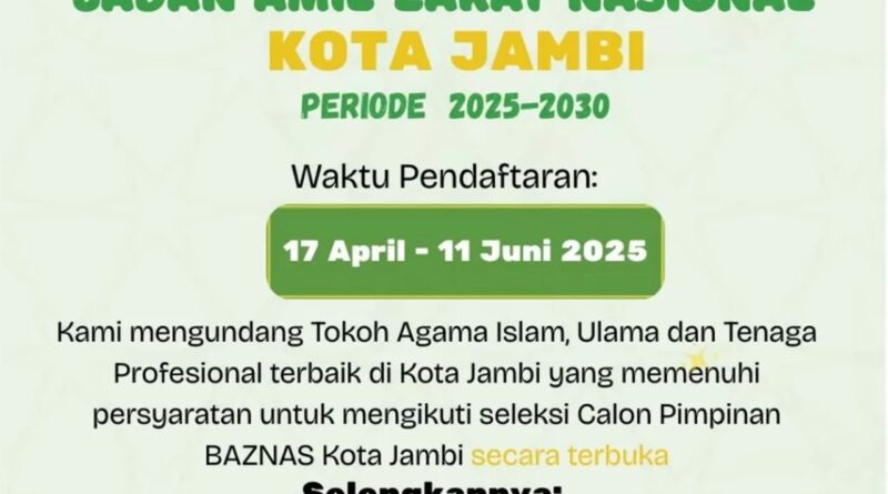 Read MoreKota Jambi, Mediator Pemerintah Kota Jambi resmi membuka pendaftaran seleksi terbuka calon pimpinan Badan Amil Zakat Nasional (BAZNAS) Kota Jambi