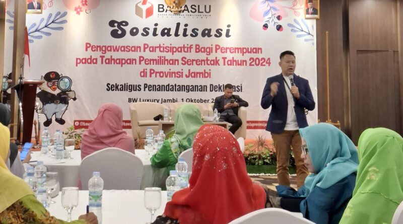 Dalam rangka mendorong keterlibatan perempuan dan meningkatkan partisipasi perempuan dalam proses demokrasi, Bawaslu Provinsi Jambi menggelar Sosialisasi Pengawasan Partisipastif bagi Perempuan pada tahapan Pemilihan serentak tahun 2024 di Provinsi Jambi sekaligus penandatangan deklarasi Perempuan Jambi menuju Pemilihan/Pilkada serentak tahun 2024 yang damai dan berintegritas, kemarin kemarin Selasa, 1 Oktober 2024, di BW Luxury Hotel – Jambi.