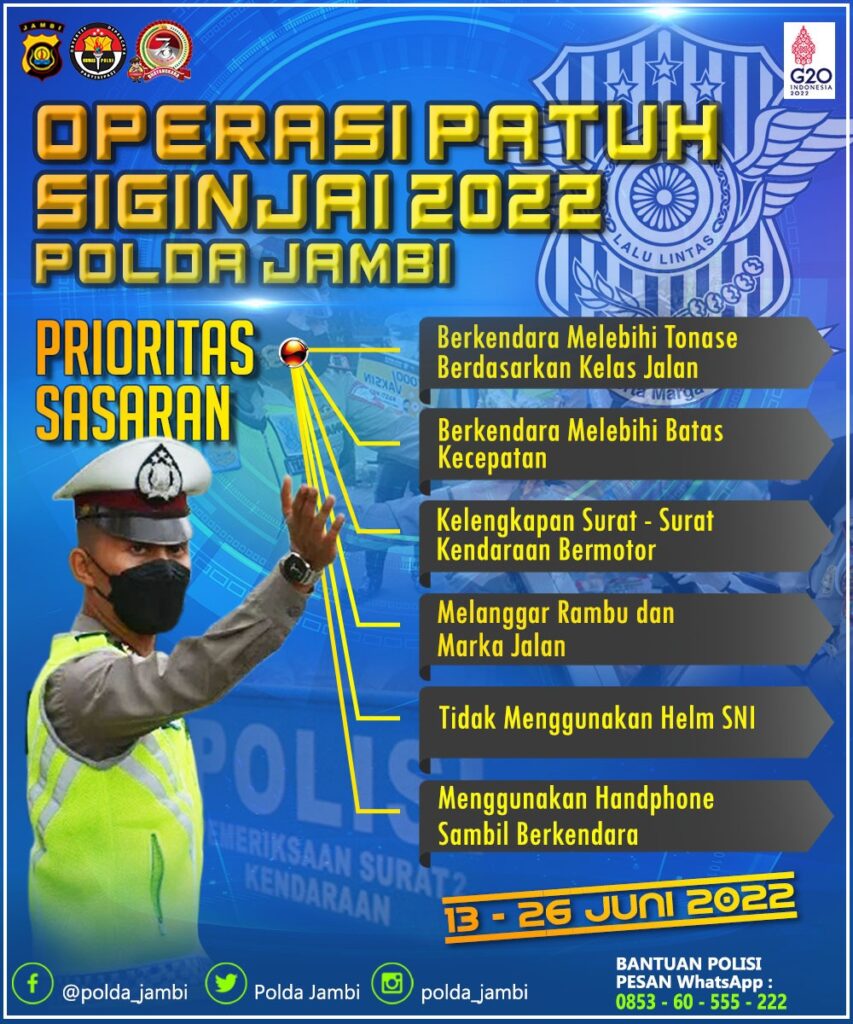 Kepolisian Daerah Jambi (Polda Jambi) akan laksanakan Operasi Patuh Siginjai 2022 yang akan dilaksanakan serentak se-Indonesia, mulai besok, Senin, (13/06/2022) hingga Minggu (26/06/2022) mendatang.