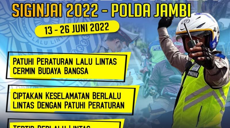 Kepolisian Daerah Jambi (Polda Jambi) akan laksanakan Operasi Patuh Siginjai 2022 yang akan dilaksanakan serentak se-Indonesia, mulai besok, Senin, (13/06/2022) hingga Minggu (26/06/2022) mendatang.