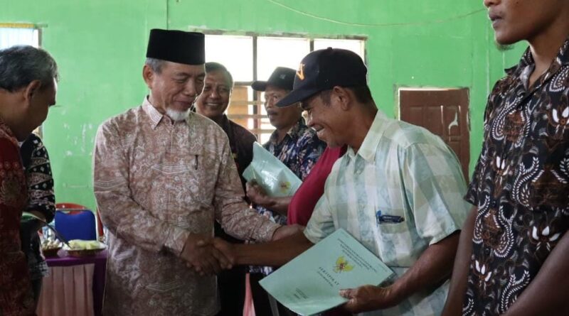 Bupati Merangin H Mashuri menyerahkan sertifikat retribusi distribusi sertifikasi (Redis) kepada masyakat Desa Tanjung Benuang Kecamatan Pamenang Selatan, Kamis (31/8).