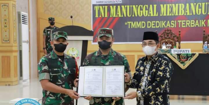 Acara dilanjutkan dengan Penandatanganan Naskah Hasil Program Pelaksanaan TMMD ke-113 dan Penyerahan Naskah oleh Danrem 042/Garuda Putih Kepada Bupati Tanjung Jabung Barat.