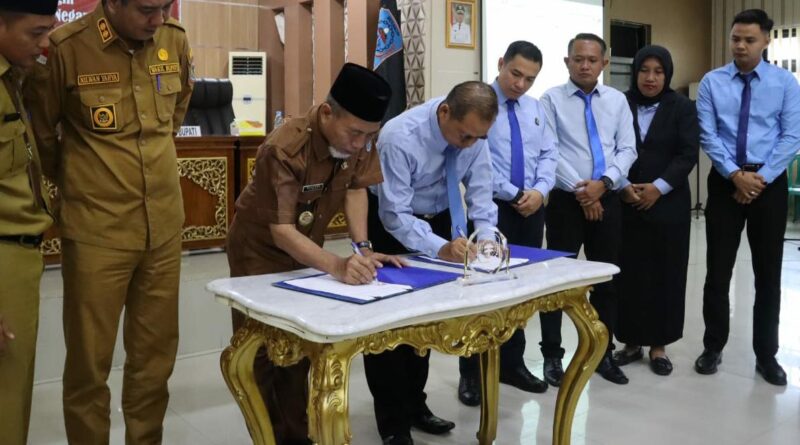 Bupati Merangin H Mashuri menandatangani kerjasama bantuan hukum antara Pemkab Merangin dengan Kejari Merangin bidang perdata dan tata usaha negara tahun 2023, di Ruang Pola Utama kantor lama bupati Merangin, Selasa (09/5/2023).