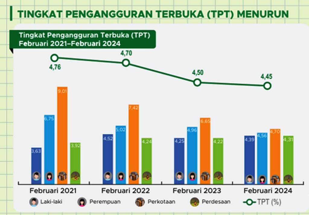 Tingkat Pengangguran Terbuka (TPT) di Provinsi Jambi pada Februari 2024 menunjukkan hasil yang menggembirakan, yaitu sebesar 4,5 persen, turun 0,05 persen poin dibandingkan Februari 2023, di bawah rata-rata nasional (6,8%). Penurunan ini menunjukkan bahwa upaya pemerintah dalam menciptakan lapangan kerja dan meningkatkan kualitas sumber daya manusia mulai membuahkan hasil.