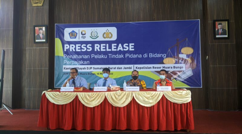 Kapolres Bungo AKBP Guntur Saputro bersama Direktorat Jendral Pajak (DJP) Sumatera Barat – Jambi (Sumbaja) menggelar Konferensi Pers terkait dengan Penahanan Tersangka Tindak Pidana Perpajakan, Rabu (16/3/2022).