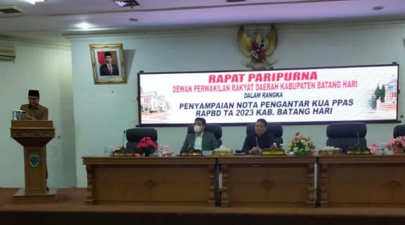 Wakil Ketua (Waka) Dewan Perwakilan Rakyat Daerah (DPRD) Kabupaten Batang Hari menggelar rapat paripurna dalam rangka penyampaian nota pengantar Kebijakan Umum Anggaran (KUA) dan Prioritas Plafon Anggaran Sementara (PPAS) Rencana Anggaran Pendapatan Belanja Daerah (RAPBD) Tahun 2023 oleh Pemerintah Kabupaten (Pemkab) Batanghari yang disampaikan langsung oleh Bupati Muhammad Fadhil Arief (MFA), Rabu (13/07/2022).