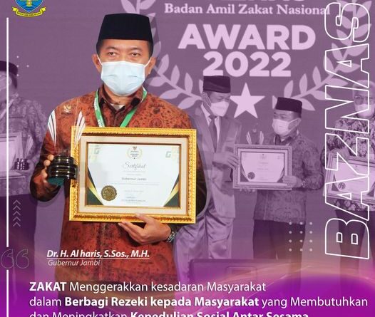 Gubernur Jambi, Dr.H.Al Haris,S.Sos.,M.H., menerima Penghargaan Badan Amil Zakat Nasional (Baznas) Award 2022 dengan kategori Gubernur Pendukung Gerakan Zakat Indonesia (GZI) 2022, bertempat di Golden Ballroom The Sultan Hotel dan Residence Jakarta Pusat, Senin (17/01/2022).