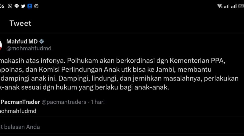 “Terima kasih atas infonya, Polhukam akan berkoordinasi dengan kementerian PPA, Kompolnas, dan Komisi Perlindungan Anak untuk bisa ke Jambi membantu mendampingi anak ini,” kata Mahfud di akun Twiternya, Senin (5/6/2023).
