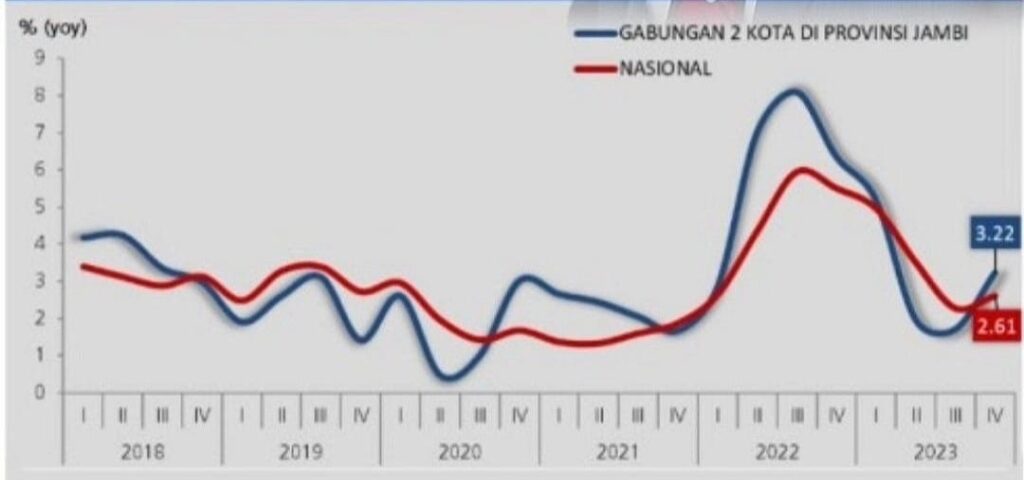 Menyimak siklus lima tahun terakhir, tingkat inflasi Provinsi Jambi sangat berfluktuatif dan sulit diprediksi. Pada triwuan I sampai dengan III-2018, inflasi Provinsi Jambi di atas rata-rata nasional, demikian pula pada triwulan IV tahun 2020 hingga triwulan II tahun 2021. Selanjutnya inflasi meningkat tajam pada triwulan II hingga IV tahun 2022. (lihat grafik)
