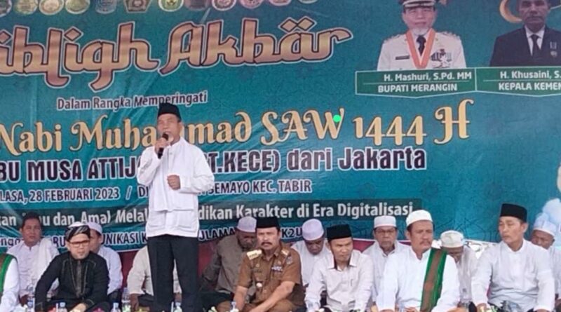 Bupati Merangin H Mashuri melakukan Tablik Akbar, peringatan Isra’ Miraj Nabi Muhammad SAW bersama Forum Komunikasi Keluarga Ulama (FKKU) Kecamatan Tabir, di Lapangan Semayo Rantau Panjang Tabir, Selasa (28/2/2023).