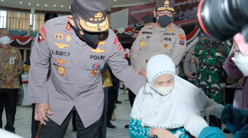 Kapolri Jenderal Listyo Sigit Prabowo meninjau secara langsung akselerasi vaksinasi serentak di Gedung Sultan Suriansyah, Banjarmasin, Kalimantan Selatan (Kalsel), Kamis (10/2/2022).