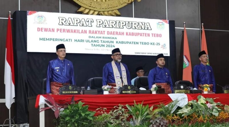 Penjabat (Pjs) Gubernur Jambi Dr. H. Sudirman, SH, MH mengemukakan bahwa peringatan ulang tahun merupakan momentum untuk evaluasi, hal-hal yang sudah baik dipertahankan bahkan ditingkatkan, sedangkan yang kurang, diperbaiki. Hal tersebut dikemukakannya saat menghadiri Rapat Paripurna DPRD Kabupaten Tebo Dalam Rangka Hari Ulang Tahun Ke-25 Kabupaten Tebo, bertempat di Aula Gedung DPRD Kabupaten Tebo, Sabtu (12/10/2024).