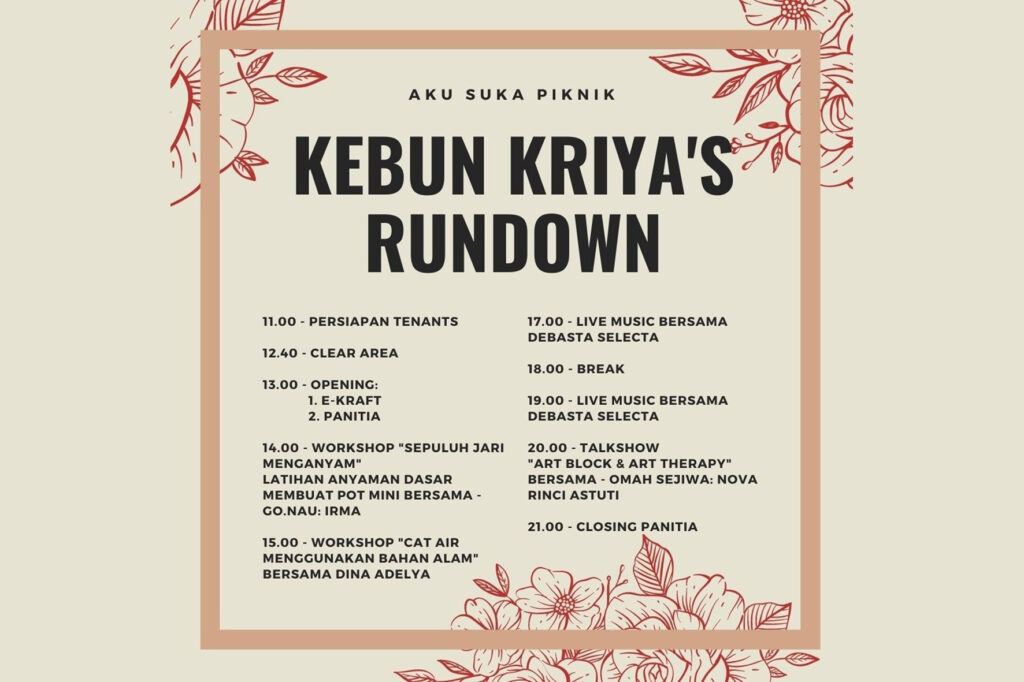 Kebun Kriya digelar Sabtu, mulai pukul 12.00 hingga 21.00 WIB. Arenanya bertempat di halaman belakang Kedai Broyat, Jl. Jend. Sudirman, Tambak Sari, Kota Jambi.