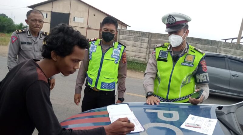Satlantas Polres Muaro Jambi melakukan menindakan terhadap 10 truk batu bara yang melanggar jam operasional saat melintas di Jalan Niaso Jambi – Sabak, Jumat (10/06/2022).