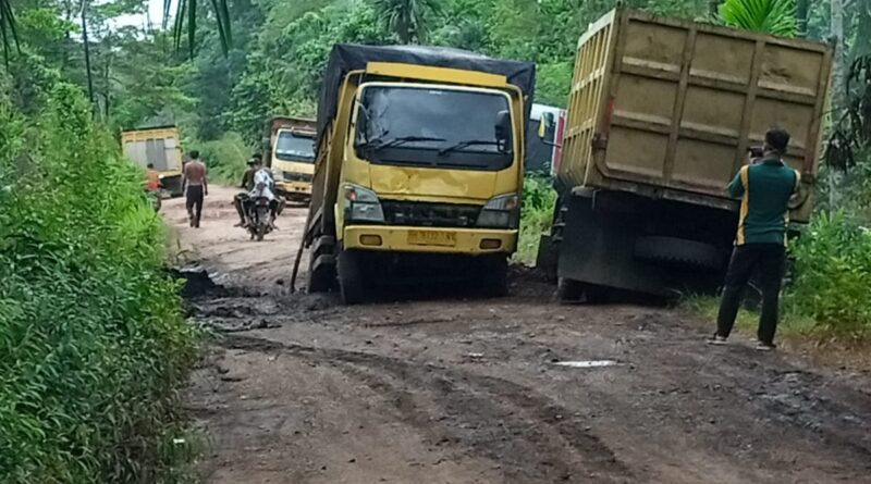 Kondisi Jalan rusak dan mobil angkutan truk angkutan batu bara ada yang mengalami kerusakan dan terbalik, membuat jalan desa Setiris menuju Desa Mudung Darat macet panjang, Jum’at (18/03/22)