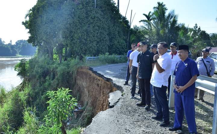 Anggota DPR RI Komisi V Dapil Jambi A. Bakrie didampingi Pj. Bupati Tebo Aspan dan beberapa Kepala Organisasi Perangkat Dearah (OPD) terkait meninjau jalan yang tergerus Sungai Batanghari.