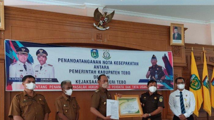Pemerintah Kabupaten Tebo menandatangani nota kesepakatan (MoU) dengan Kejari Tebo, untuk kerjasama bidang Perdata dan Tata Usaha Negara di tahun 2022, bertempat di Pendopo Rumas Dinas Bupati Tebo, Senin (07/02/2022).
