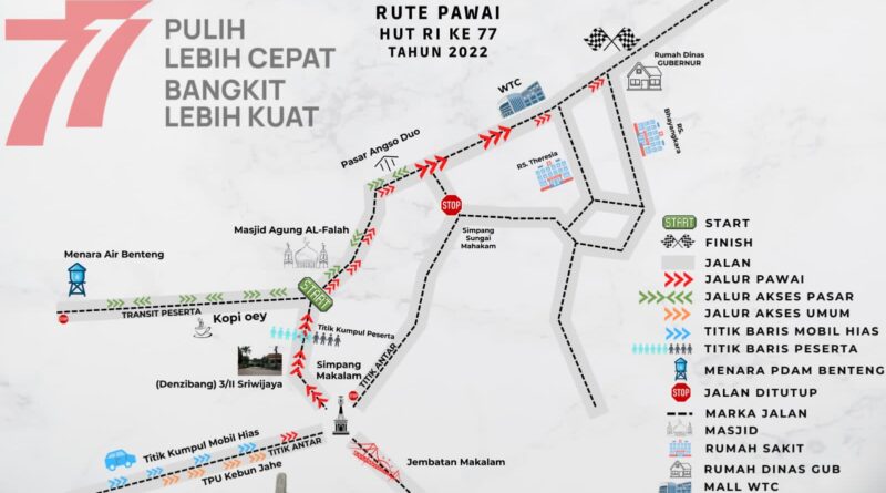 Kamis 18 Agustus 2922 akan dilakukan pawai pembangunan mulai pukul 08.00 WIB di pelataran rumah dinas Gubernur Jambi.