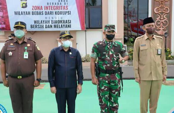 Tampak Hadir Anggota Forkompimda, Ketua DPRD, Kajari Tanjung Jabung barat, para perwira TNI dan Polri, Camat Tungkal Ilir, dan peserta Apel dari Sat Pol PP dan Dishub, Nakes dan Damkar.