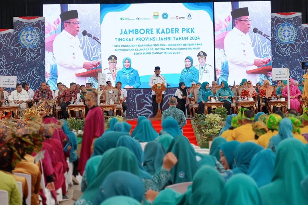 Apresiasi tersebut disampaikan Wagub pada Pembukaan Jambore TP PKK Tingkat Provinsi Jambi, bertempat di Ev Garden, Pall Merah Kota Jambi, Rabu (24/04/2024). Hadir pada kesempatan tersebut Ketua TP PKK Provinsi Jambi, Hj. Hesnidar Haris, Unsur Forkopimda Provinsi Jambi, Ketua TP PKK kab/kota se-Provinsi Jambi, para pengurus dan anggota TP PKK serta tamu undangan lainnya.