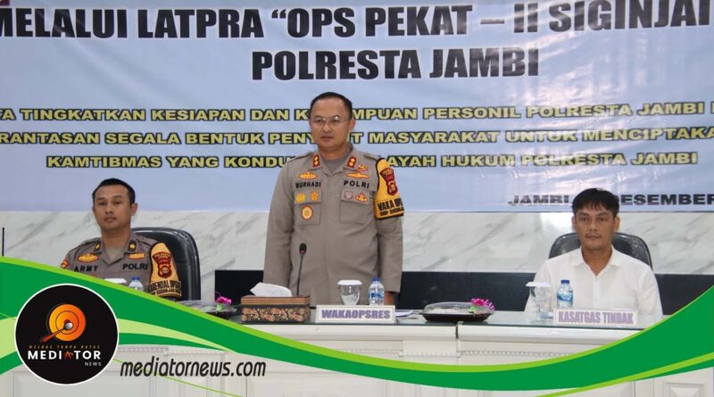 Kepolisian Resor Kota Jambi melalui Bagian Operasi (Bag Ops) menggelar Latihan Pra “Ops Pekat-II Siginjai 2024” yang dipimpin langsung Wakapolresta Jambi, AKBP. Nurhadiansyah, S.I.K bertempat di Aula Lokamanginti, Mapolresta Jambi, Senin (02/12/2024).